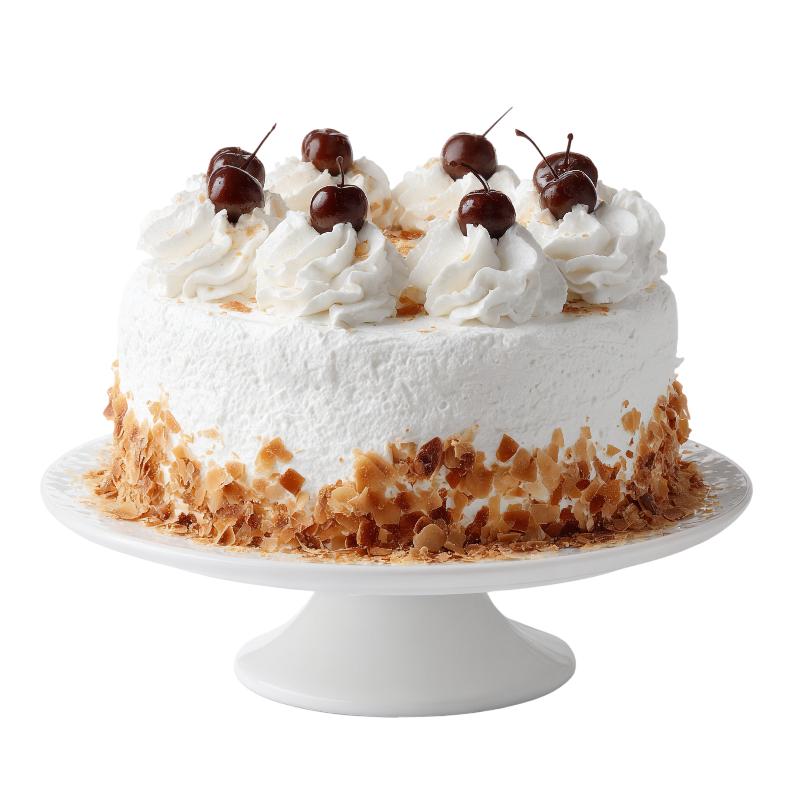 Vanilla sponge, whipped cream, refined oil, breakfast sugar, vanilla essence, white chocolate flakes, and cherry filling.